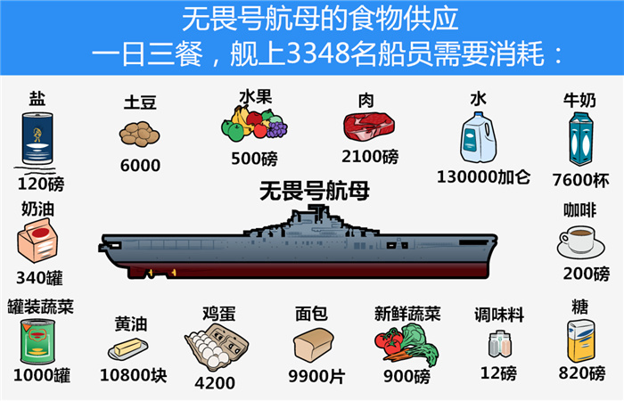 2、食物消耗:航母上艦員的日常食物供應,包括主食、副食、飲用水等,每天都需要一定的費用。