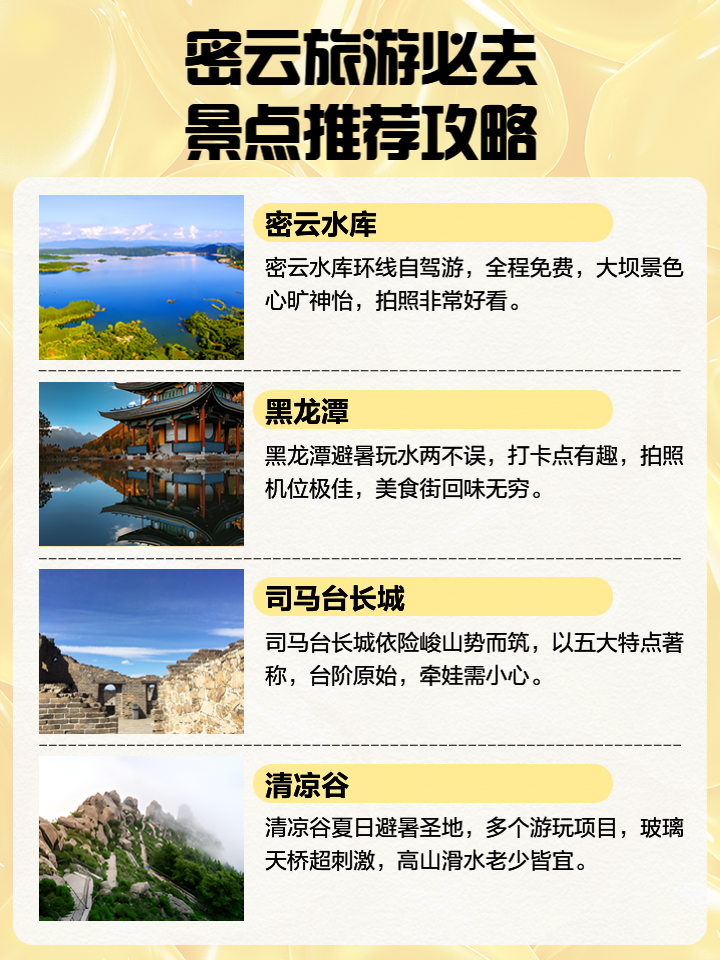 就是密云的十大旅游景點,每個景點都擁有獨特的自然風光和豐富的文化遺產(chǎn),為游客提供了一次難忘的旅游體驗,無論是探索自然風光還是感受文化氛圍,密云的這些景點都能滿足您的需求,歡迎您來到這片美麗的土地,探索自然與文化的完美結合。