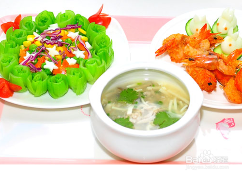 (3)土豆泥配蔬菜湯:土豆泥口感細膩,搭配各種蔬菜制成的湯,營養豐富。