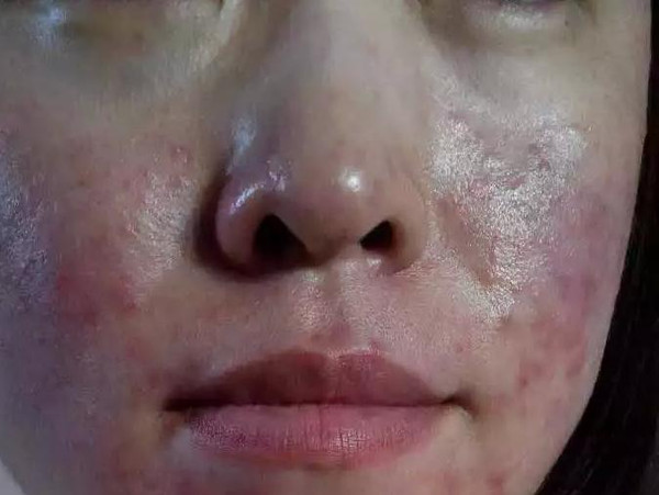 (圖片解析):這張圖片展示了激素臉患者皮膚變薄、紅血絲明顯的癥狀,長(zhǎng)期使用激素導(dǎo)致皮膚屏障受損,使皮膚變得敏感脆弱。