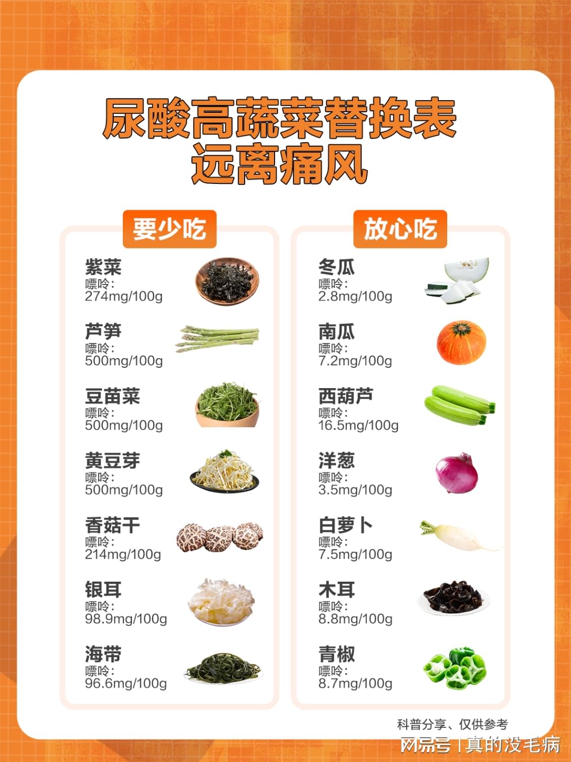 為了降低尿酸水平,患者應該多吃低嘌呤食物,如蔬菜、水果、谷物等,這些食物富含纖維、維生素和礦物質,有助于身體健康。