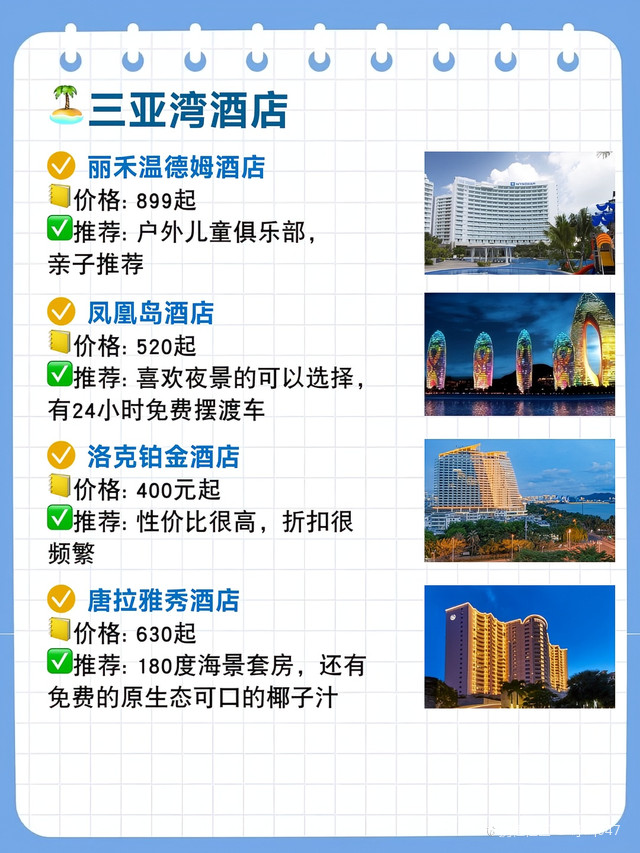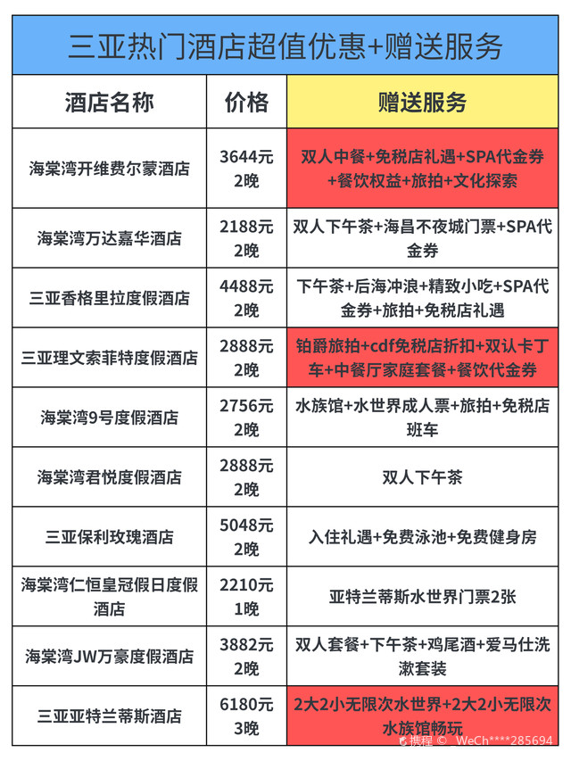 五星級房間:每晚800元至2500元人民幣不等,特色:熱帶花園、兒童俱樂部和豐富的水上活動,4. 三亞香格里拉度假酒店五星級房間:每晚1200元至3500元人民幣不等,特色:位于三亞灣,擁有私人海灘、豪華泳池和水療中心,5. 三亞亞龍灣鉑爾曼度假酒店五星級房間:每晚900元至3000元人民幣不等,特色:法式風(fēng)情度假酒店,提供多種餐飲選擇和水上樂園,6. 三亞亞龍灣熱帶天堂森林公園酒店五星級至七星級房間:每晚1500元至5000元人民幣不等特色:熱帶主題酒店,擁有叢林探險、玻璃棧道等獨特體驗,7. 三亞亞龍灣人間天堂-鳥巢度假村五星級至八星級房間:每晚2000元至萬元以上人民幣不等特色:獨特的鳥巢主題客房、懸崖餐廳和豐富的戶外探險活動,8. 三亞灣紅樹林酒店五星級房間:每晚18元至人民幣不等特色:大型綜合度假勝地,擁有購物中心、博物館等配套設(shè)施,價格根據(jù)房型和預(yù)訂時間有所變動,以上價格僅供參考,具體價格還需根據(jù)季節(jié)、預(yù)訂時間和房型進行確認,在選擇酒店時,請根據(jù)您的需求和預(yù)算進行篩選,除了價格因素外,還可以關(guān)注酒店的設(shè)施、服務(wù)以及客戶評價等方面,建議您在預(yù)訂前查看酒店的官方網(wǎng)站或相關(guān)旅游平臺以獲取最新信息和優(yōu)惠活動,在享受三亞的美麗風(fēng)光的同時,選擇合適的住宿將為您的旅程增添更多樂趣,無論是追求奢華體驗還是經(jīng)濟型住宿的旅客都能找到適合自己的住宿選擇,希望這份三亞酒店價格表能夠幫助您規(guī)劃一次完美的熱帶度假旅行!在您的旅途中享受陽光沙灘、美食文化以及獨特的熱帶風(fēng)情吧!